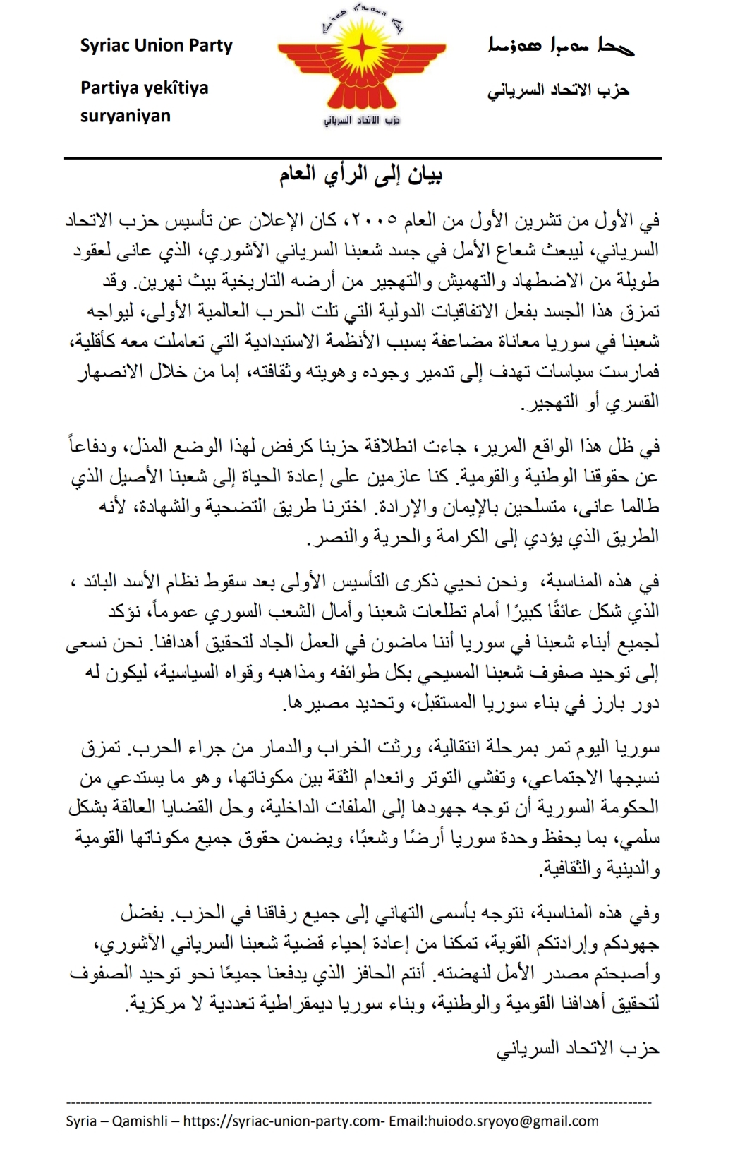 في الأول من تشرين الأول عام 2005، تم الإعلان عن تأسيس حزب الاتحاد السرياني، ليبعث شعاع الأمل في جسد شعبنا السرياني الآشوري، الذي عانى لعقود طويلة من الاضطهاد والتهميش والتهجير من أرضه التاريخية بيث نهرين. وقد تمزق هذا الجسد بفعل الاتفاقيات الدولية التي تلت الحرب العالمية الأولى، ليواجه شعبنا في سوريا معاناة مضاعفة بسبب الأنظمة الاستبدادية التي تعاملت معه كأقلية، فمارست سياسات تهدف إلى تدمير وجوده وهويته وثقافته، إما من خلال الانصهار القسري أو التهجير.