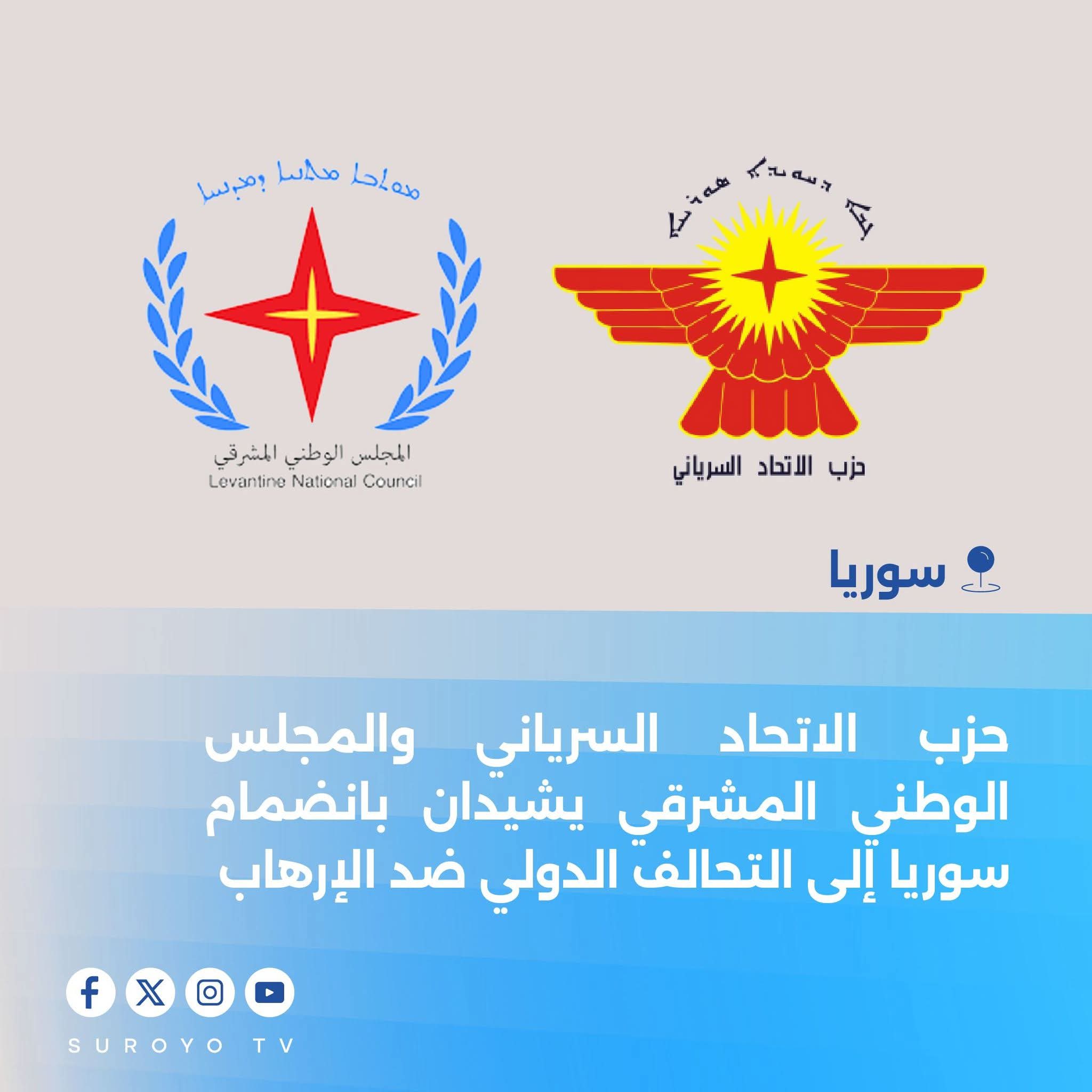 رحب حزب الاتحاد السرياني بانضمام سوريا إلى التحالف الدولي لمكافحة الإرهاب، واصفاً الخطوة بأنها تضع سوريا في صف المجتمع الدولي.