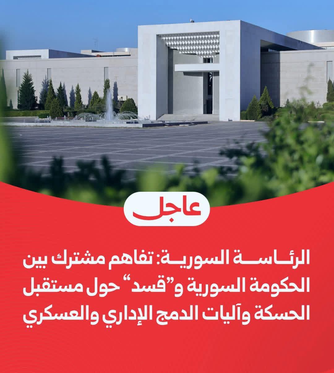 أعلنت رئاسة الجمهورية التوصل إلى تفاهم مشترك بين الحكومة السورية وقوات سوريا الديمقراطية (قسد)، يتناول عدداً من القضايا المتعلقة بمستقبل محافظة الحسكة وآليات إدارتها خلال المرحلة المقبلة.