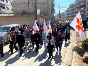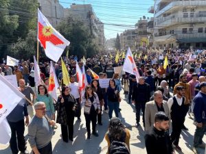 As part of the ongoing series of condemnations and rejections of the new Syrian constitutional declaration, which was signed by the head of the transitional phase in Syria, “Ahmad Al-Sharaa,” last Thursday, parties, components, and residents of the city of “Qamishli” in the Autonomous Administration of North and East Syria, including the Syriac Union Party, organized a demonstration that started from “Khalij” roundabout and moved toward the United Nations headquarters in “Qamishli.”