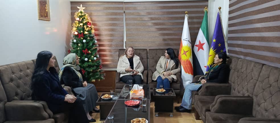 A women’s delegation visited the headquarters of the Syriac Union Party to convey congratulations and best wishes on the occasion of Christmas. The delegation included Ms. Shaha Khalil, representing the Organizational Office of the Movement for a Democratic Society (TEV_DEM) in North and East Syria, and Ms. Afaf Haski, representing the Diplomatic Relations Office of the Women’s Movement for a Democratic Society (TEV_DEM) in North and East Syria.