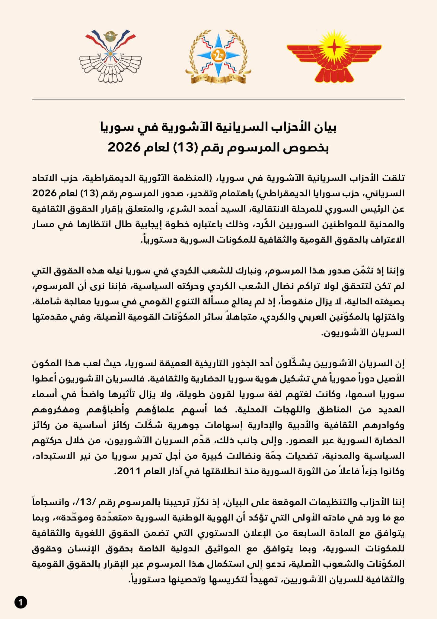 The Syriac-Assyrian parties in Syria, the Syriac Union Party, the Assyrian Democratic Organization, and the Suraya Democratic Party, have received with interest and appreciation the issuance of Decree No. 13 of 2026 by the President of the Syrian Transitional Phase, Mr. Ahmad al-Sharaa, concerning the recognition of the cultural and civil rights of Kurdish Syrian citizens. This step is considered a long-awaited positive development in the process of constitutional recognition of the national and cultural rights of Syria’s components.